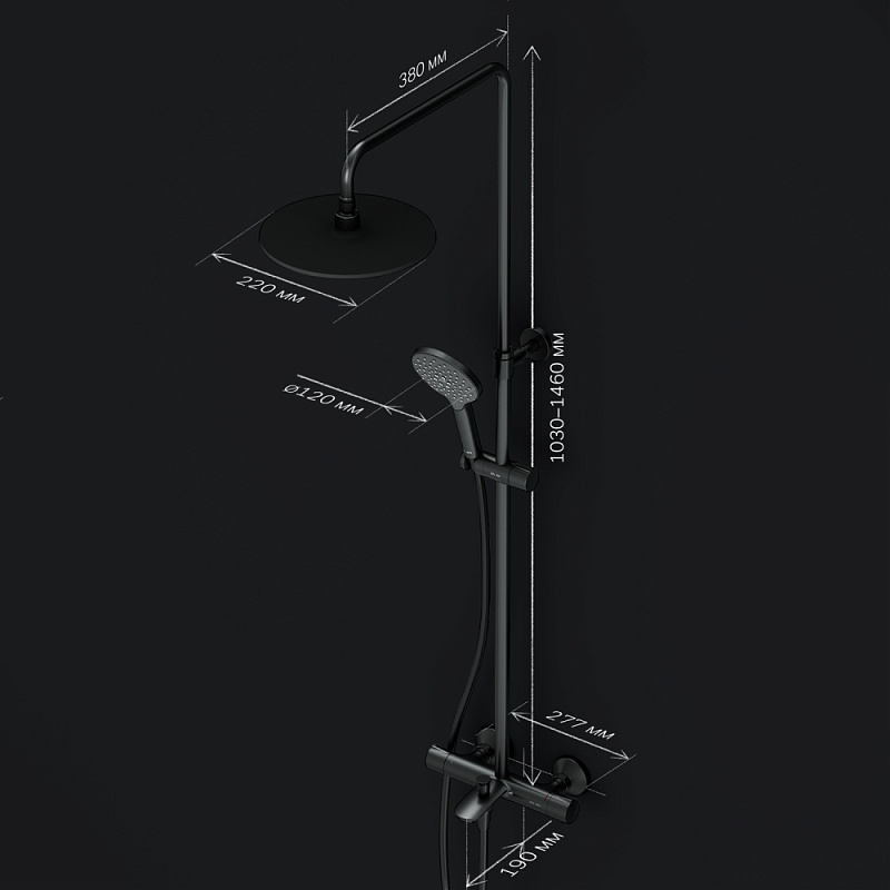 В комплектацию душевой системы входят: тропический душ, ручной душ, смеситель с изливом, эксцентрики, держатели штанги и душа. Длина душевой штанги - 1030-1460 мм. Длина душевого шланга - 1750 мм. Размер ручного душа - 120 мм. Диаметр верхнего душа - 220 мм.
