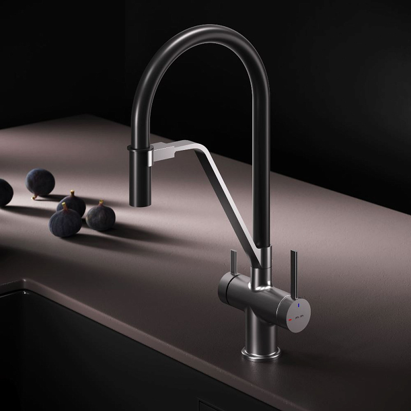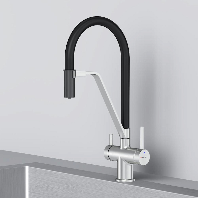 Смесители Смеситель для кухни AM.PM Func F8F07812 высокий, сатин с каналом для питьевой воды и гибким черным изливом купить в Москве.