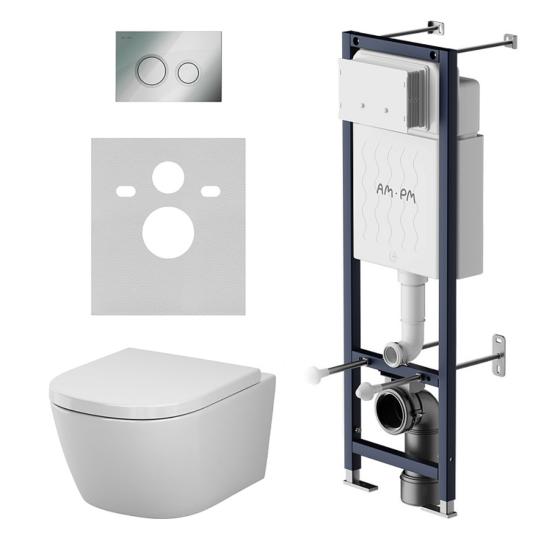 Готовый комплект к установке: система инсталляции для подвесного унитаза AM.PM Libre IS110151.601900 с механической клавишей хром, подвесной унитаз AM.PM Libre C601900SC.