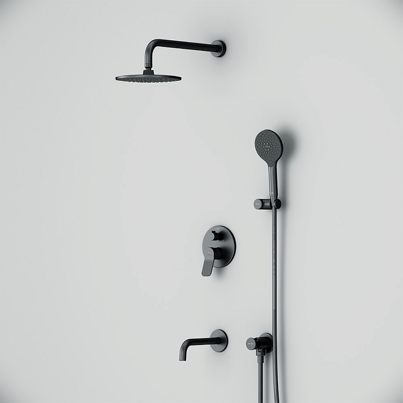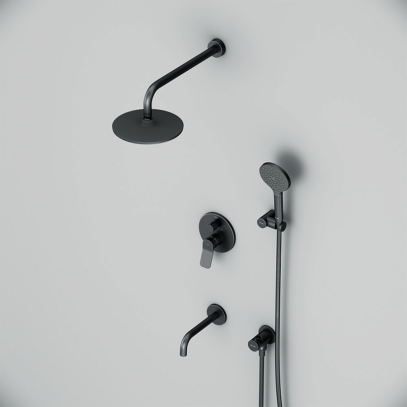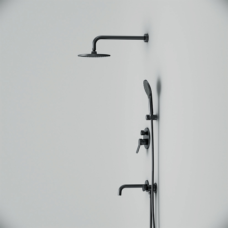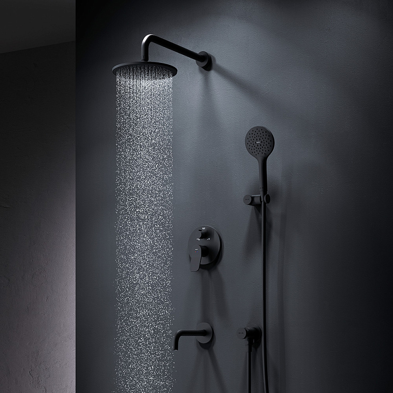 Размер ручного душа - 120 мм. Длина душевого шланга - 1750 мм. Размер держателя лейки ручного душа (Ш/Г/В): 106x75x42 мм. Цвет - черный. Монтируемый в стену излив - это современное решение для экономии пространства. Длина излива составляет 204 мм. Цвет - черный. Размер смесителя (Ш/Г/В): 150x144x180 мм. Материал встраиваемой душевой системы - Латунь, Zamak, нержавеющая сталь, PPA.